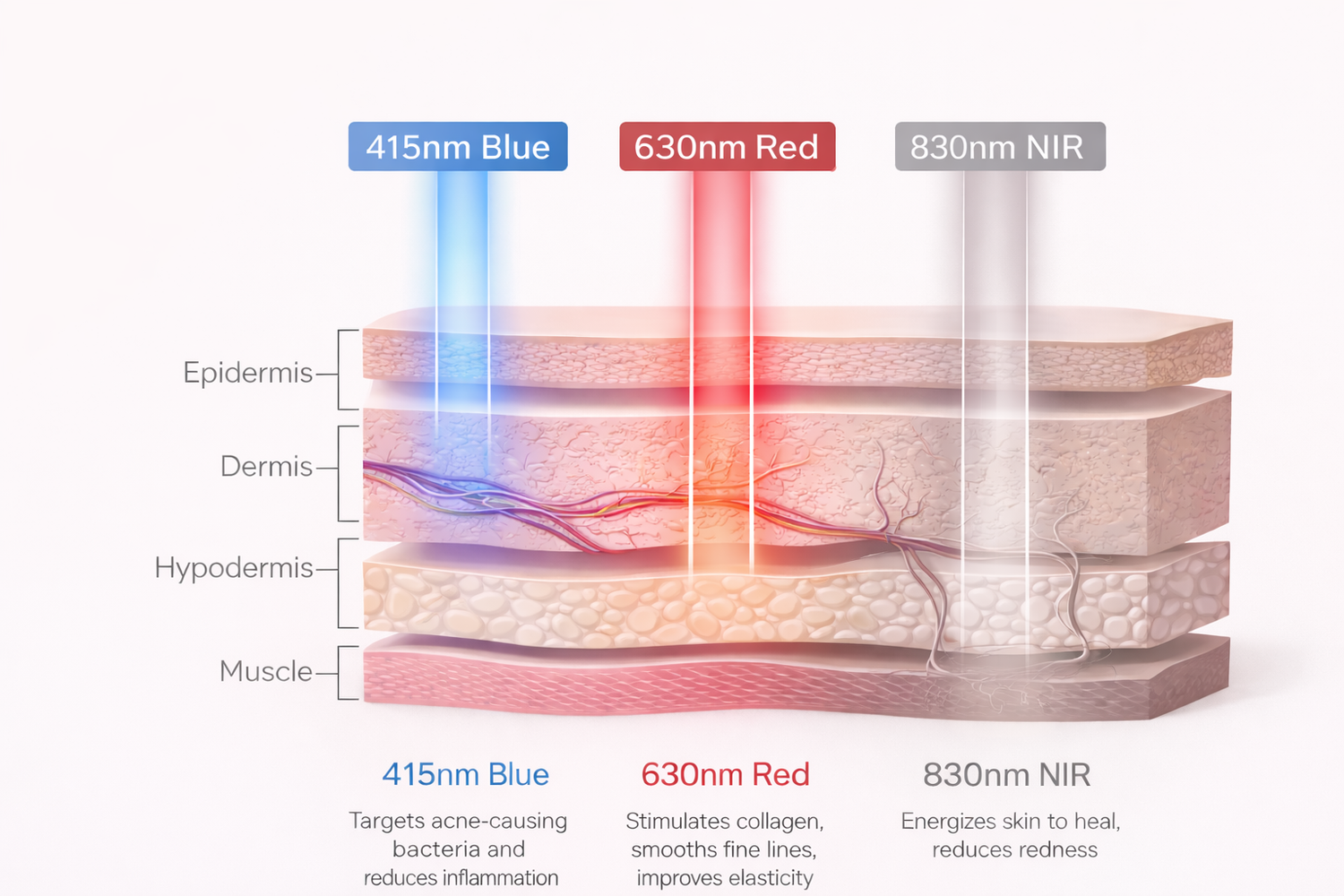 - Precise wavelengths: 415nm, 630nm, 830nm
