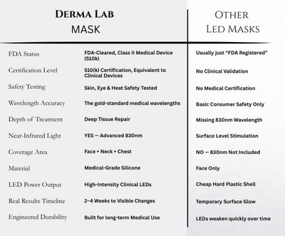 Derma Lab was engineered to deliver the same wavelength precision used in dermatology clinics. With FDA 510(k) clearance, clinical power, and medical-grade design, it provides treatment-level results without leaving your home. This is LED therapy built for real skin improvement, not influencers.